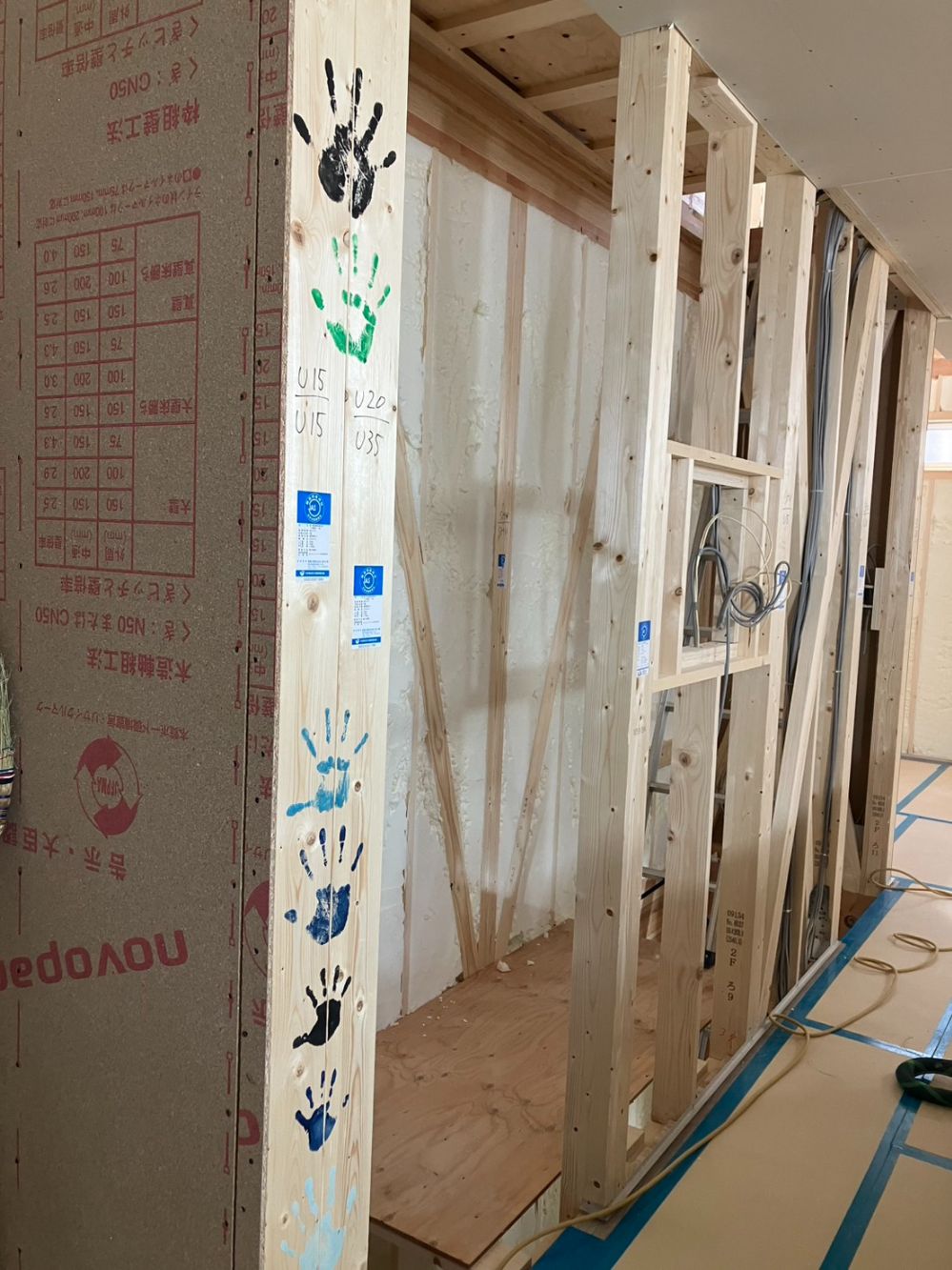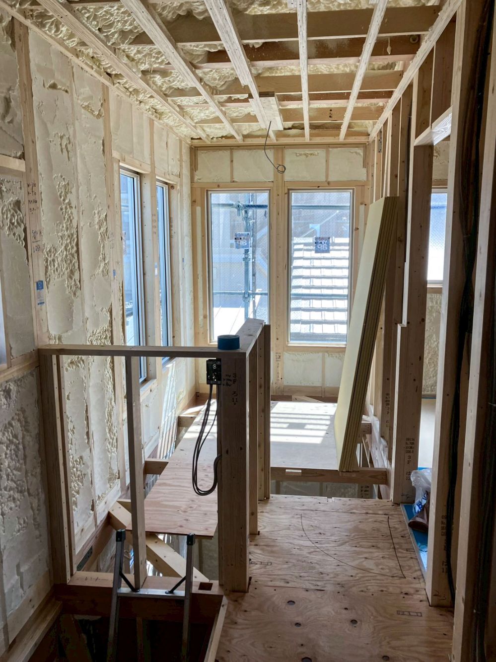 吹付断熱が終わると、お家の形がよりはっきり見えてくるだけでなく、