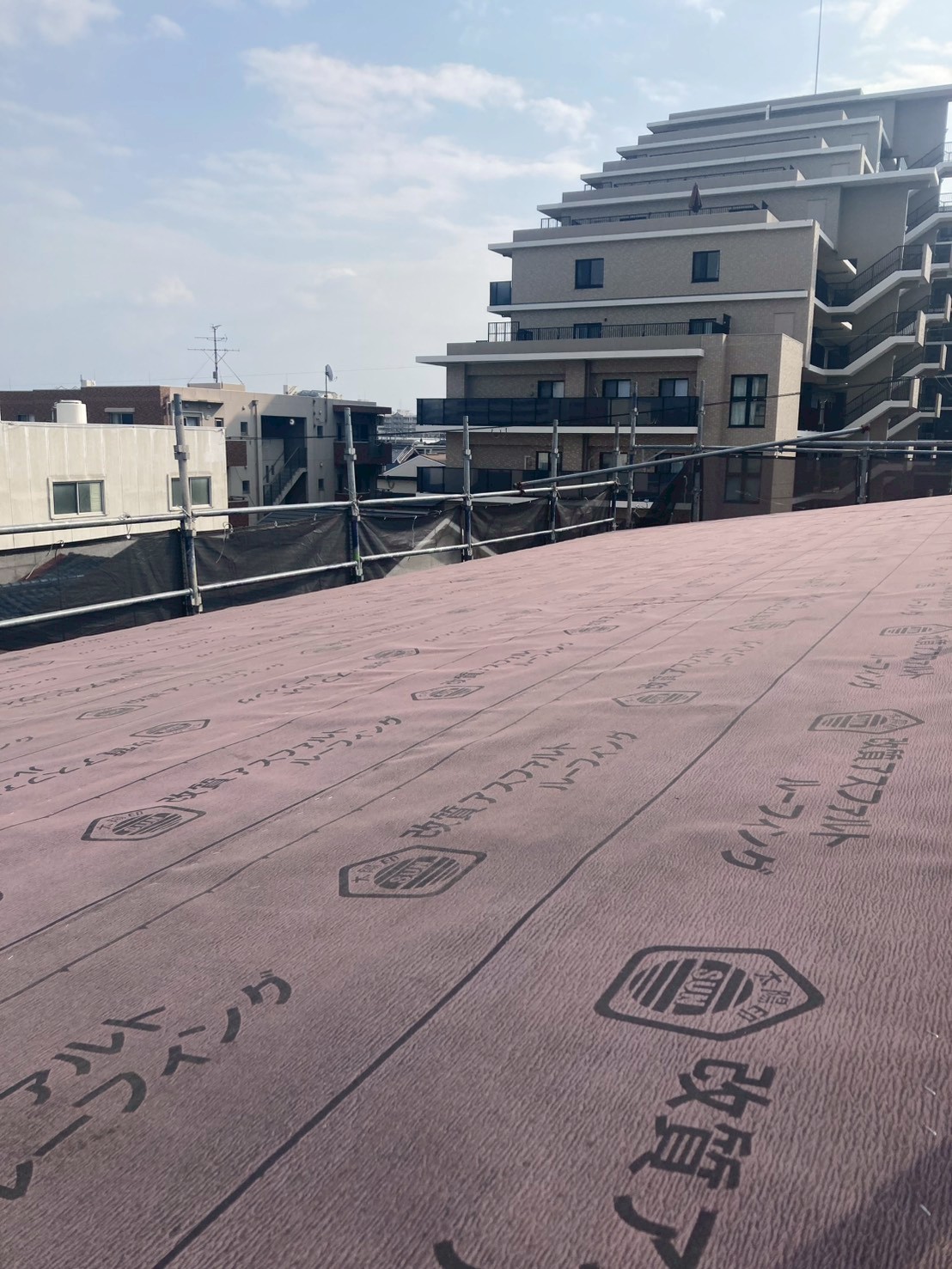 屋根の工程は「野地板」と呼ばれる屋根の下地を貼った後、「ルーフィング」と呼ばれる防水シートを貼ります。