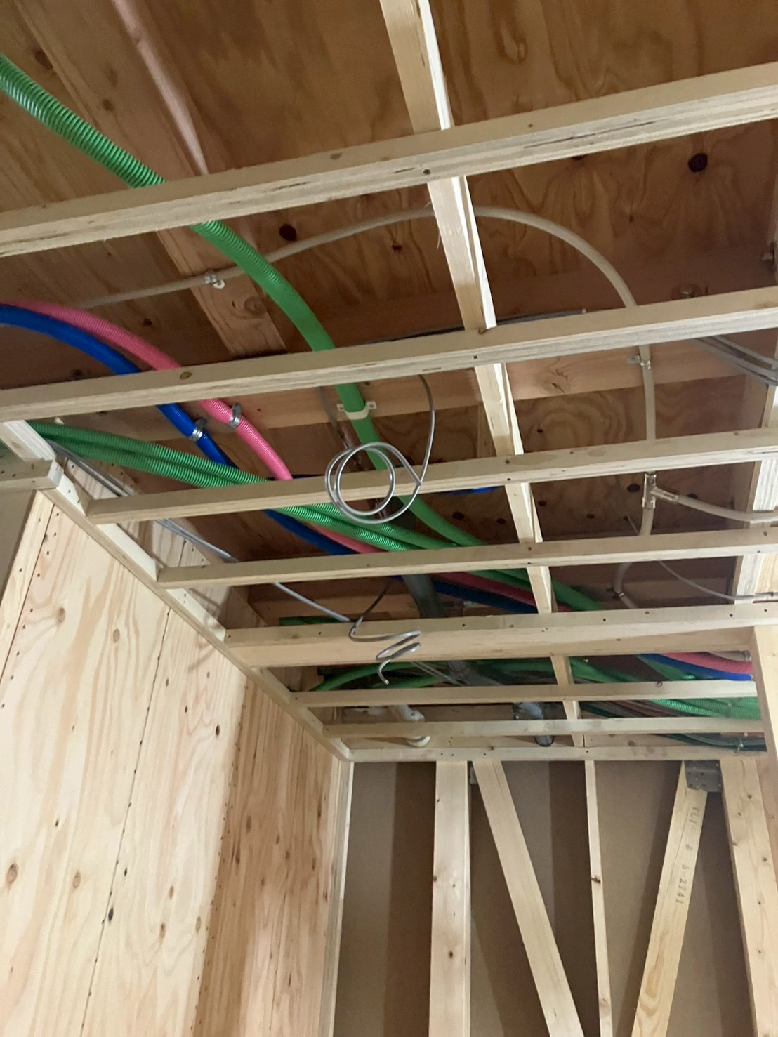 配線や配管は、吹付断熱が終わると隠れてしまうため、図面に沿って必要な場所に先んじて仕込んでおく必要があります。