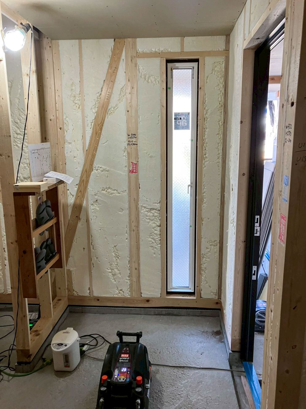 配線や配管の逃げが終われば、いよいよ吹付断熱です!