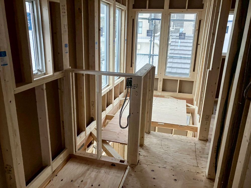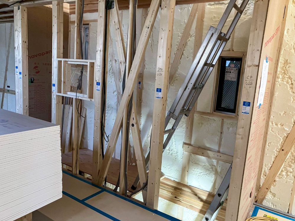 現在は屋根や外壁など外部工事や吹付断熱が終わり、内部ではボード、床の施工がどんどん進んでいます!