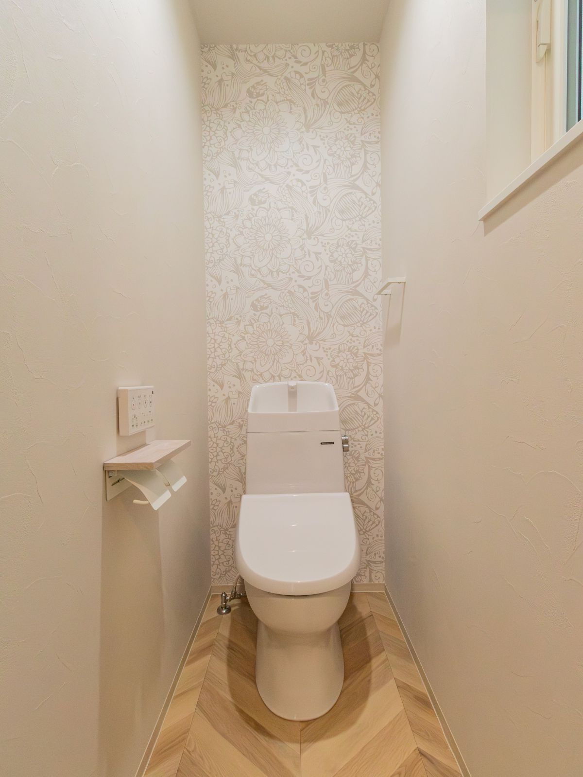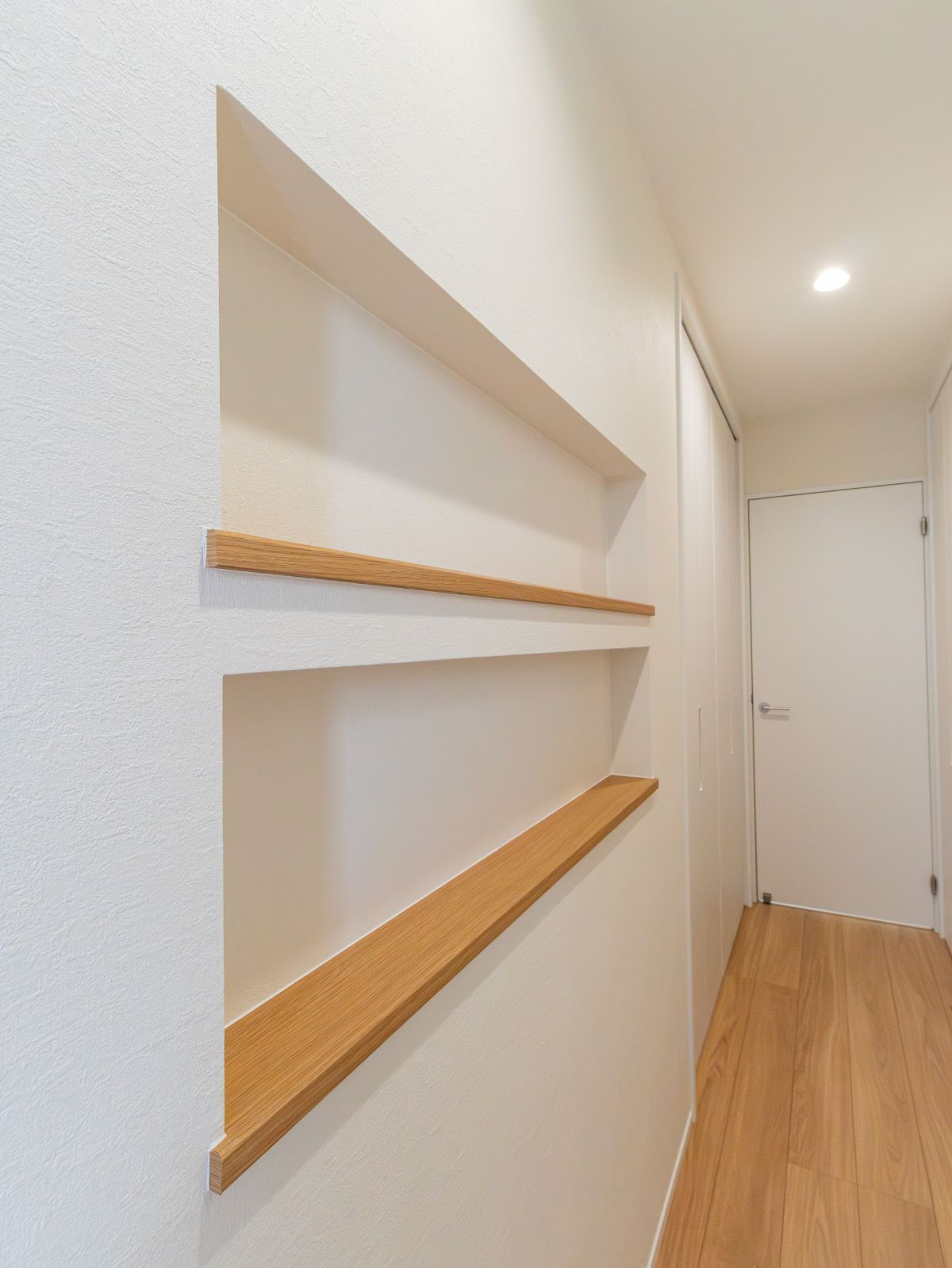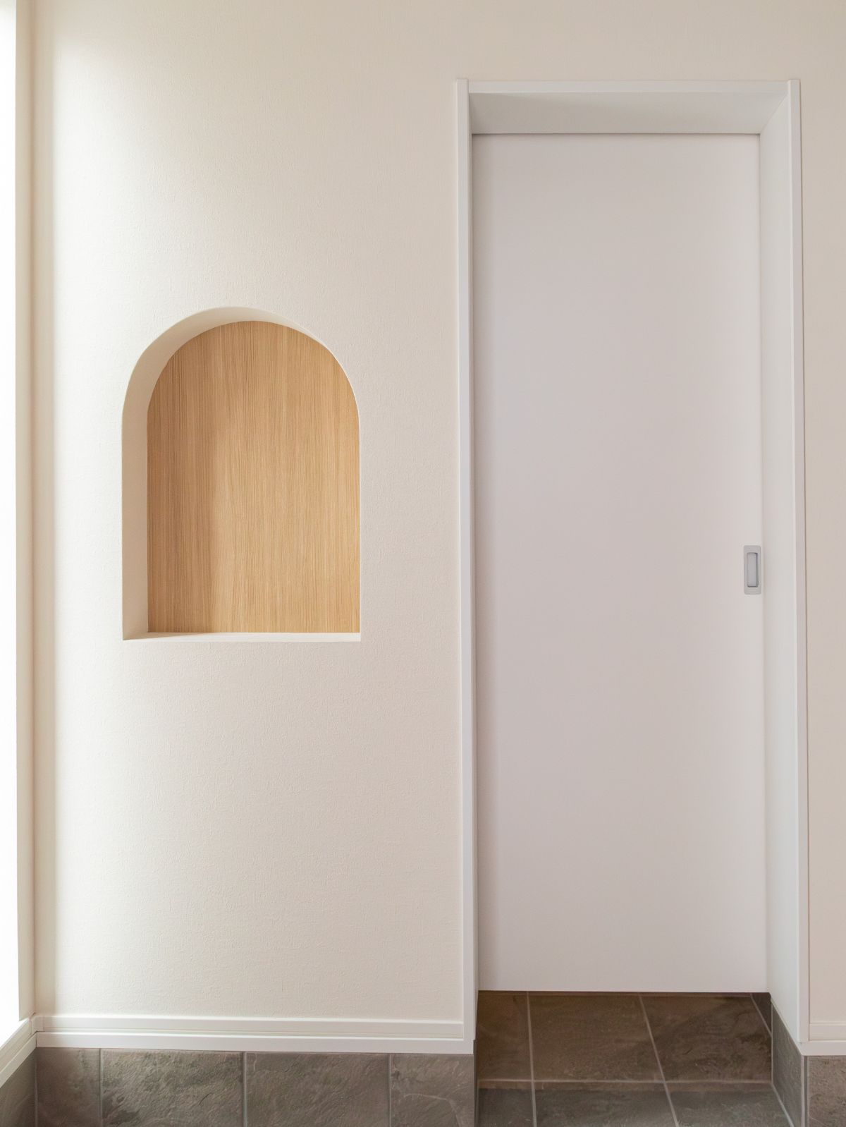 玄関に入ると、木目柄のアクセントクロスがかわいいアーチ状のニッチがお出迎え。
