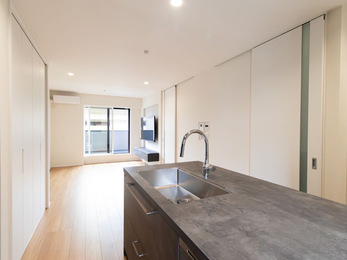 シックモダンな内装で洗練された上品な空間と、二人並んでも快適なアイランド型キッチン