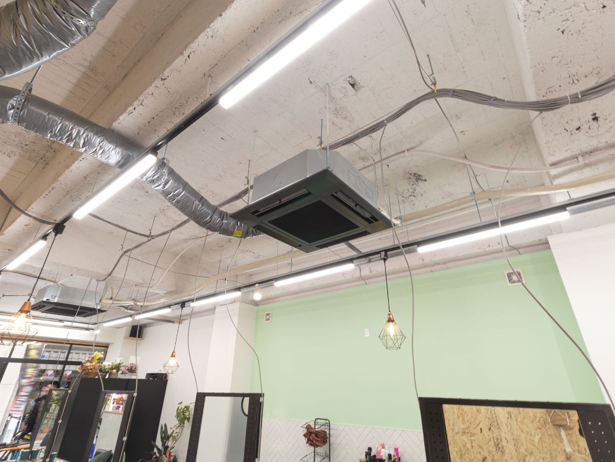店内はコンクリート打ちっぱなし+ホワイト塗装、さらに爽やかなサワーグリーンの壁紙が、圧迫感を感じさせない明るい空間にしています。