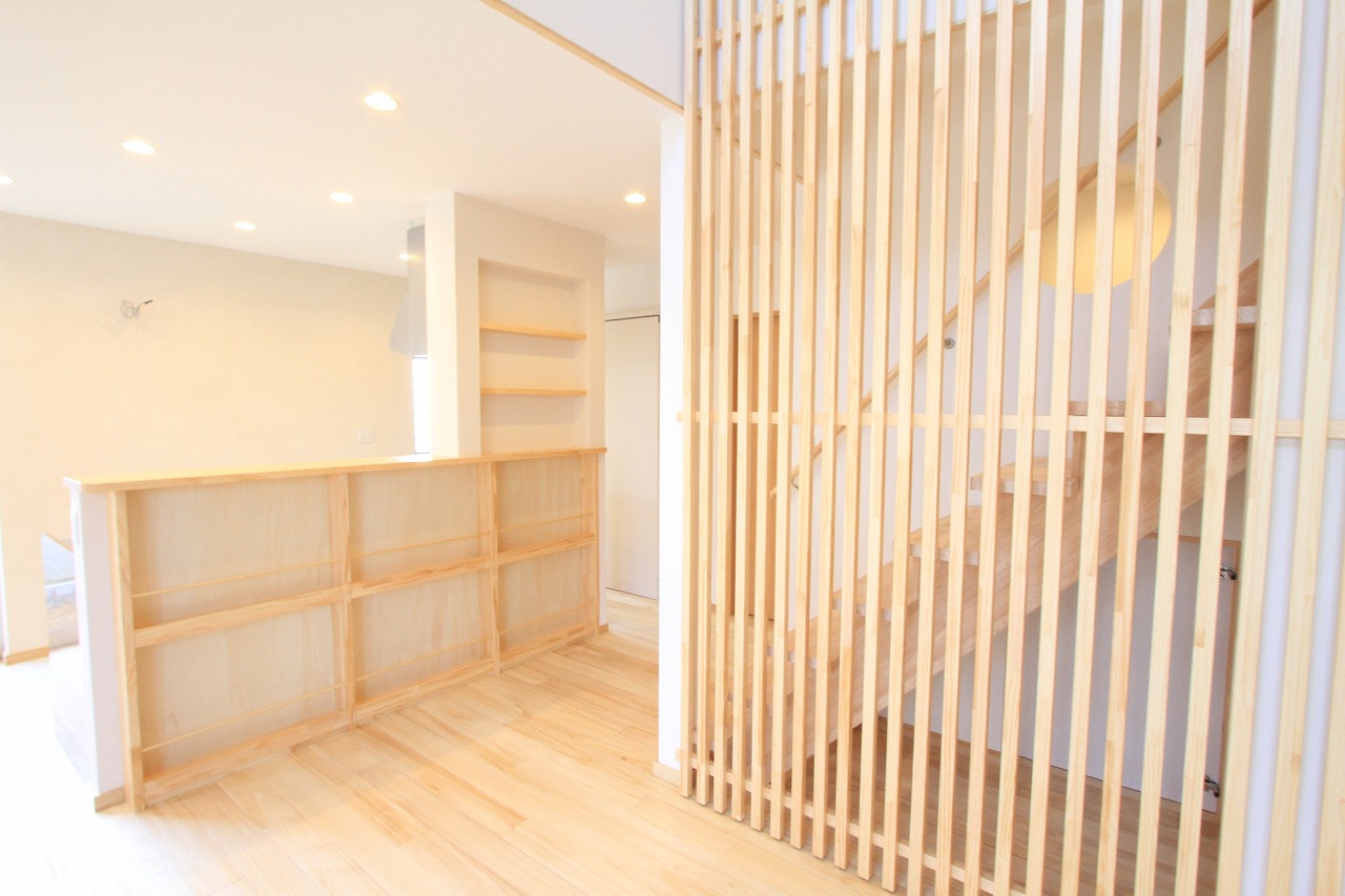 無垢床と珪藻土壁に、吹き抜けいっぱいの格子スクリーンを作ってもらいました。